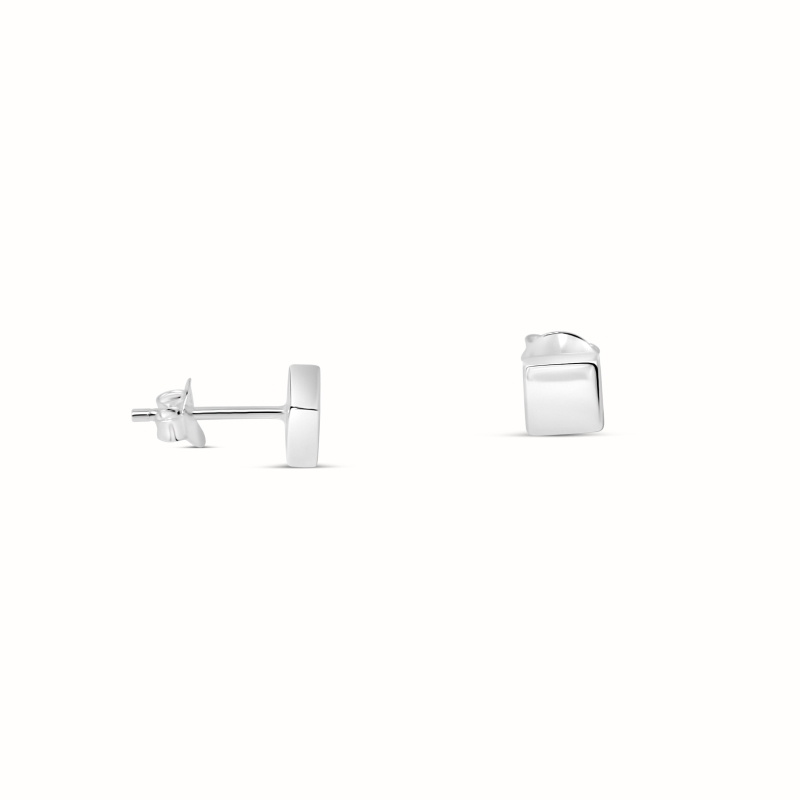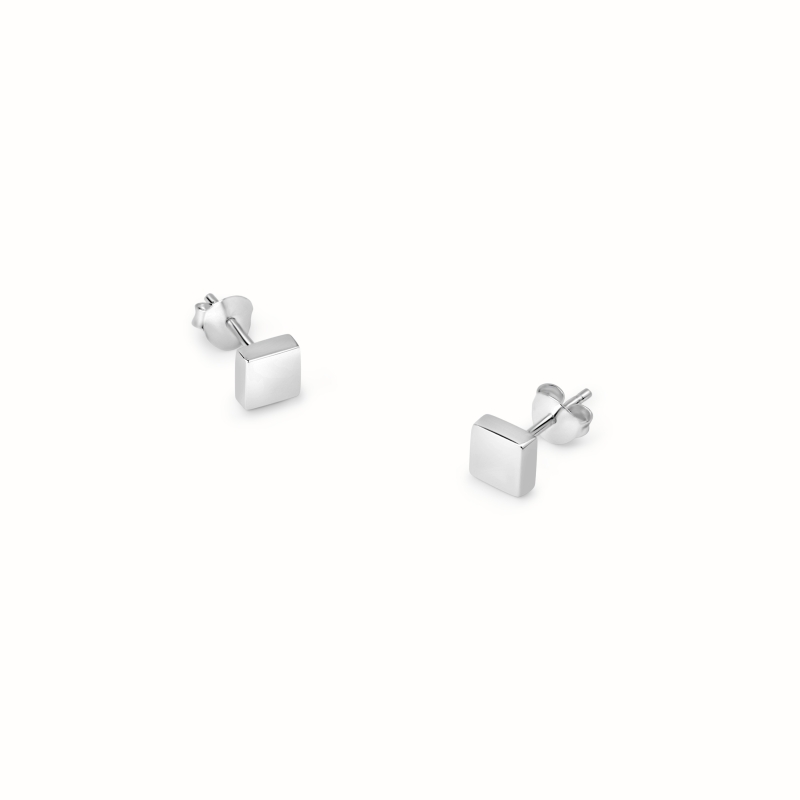 The earrings feature a square pattern in 925 sterling silver, with slightly rounded edges for a softer look. The dimensions of the earrings are approximately 1.5 cm in width. The earrings are equipped with a stud clasp for easy and secure use.